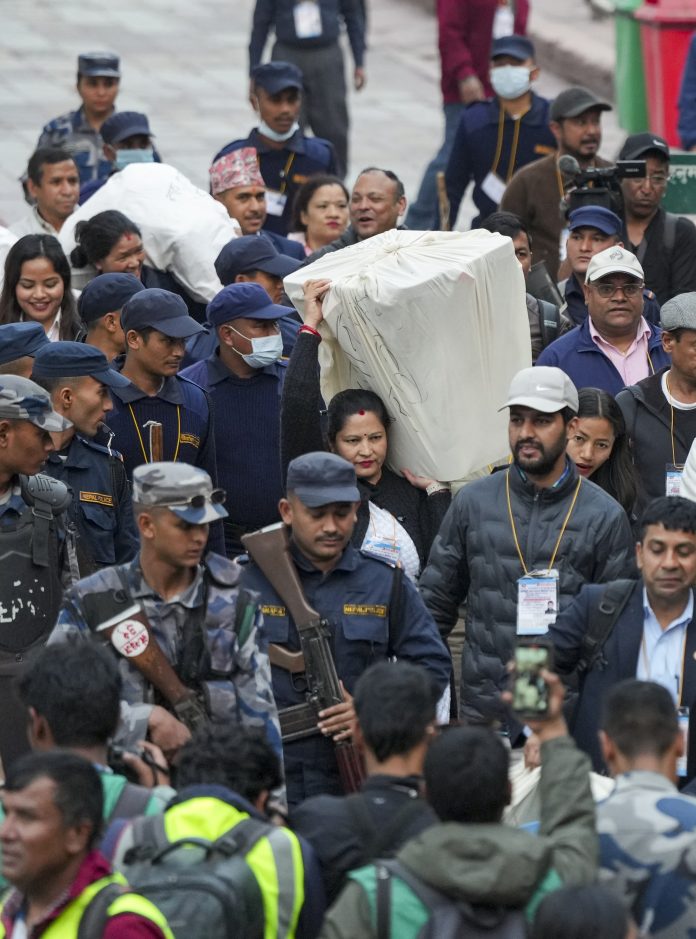 Kathmandu: Polling officials carry sealed ballot boxes amid tight security upon the conclusion of voting in the Nepal parliamentary elections, in Kathmandu, Nepal, Thursday, March 5, 2026. (PTI Photo/Arun Sharma)(PTI03_05_2026_000388B)