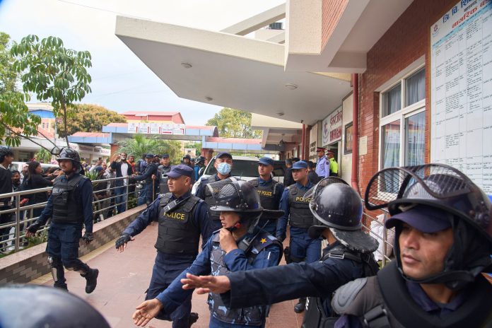 Nepalese policemen clear the street as former Prime Minister Khadga Prasad Oli is taken for procedural medical checkup after he was arrested by police over September protest deaths in Kathmandu, Nepal, Saturday, March 28, 2026. AP/PTI(AP03_28_2026_000165B)