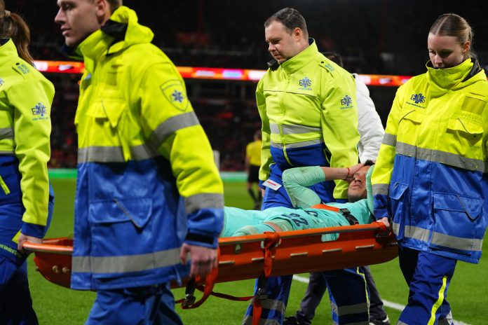 Ecuador’s goalkeeper Gonzo Valle is taken off the pitch during a friendly soccer match between the Netherlands and Ecuador in Eindhoven, Netherlands, Tuesday, March 31, 2026. AP/PTI(AP04_01_2026_000014B)