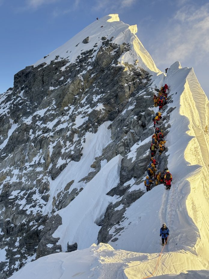 Agartala: In this image provided by the team of Aritra Roy, who became the first person from Tripura state to scale the Mount Everest summit, are seen mountaineers on the route to the summit of Mt. Everest, Nepal. Roy scaled the peak at 7:41 AM on May 19, 2025. (PTI Photo) (PTI05_22_2025_000310B)