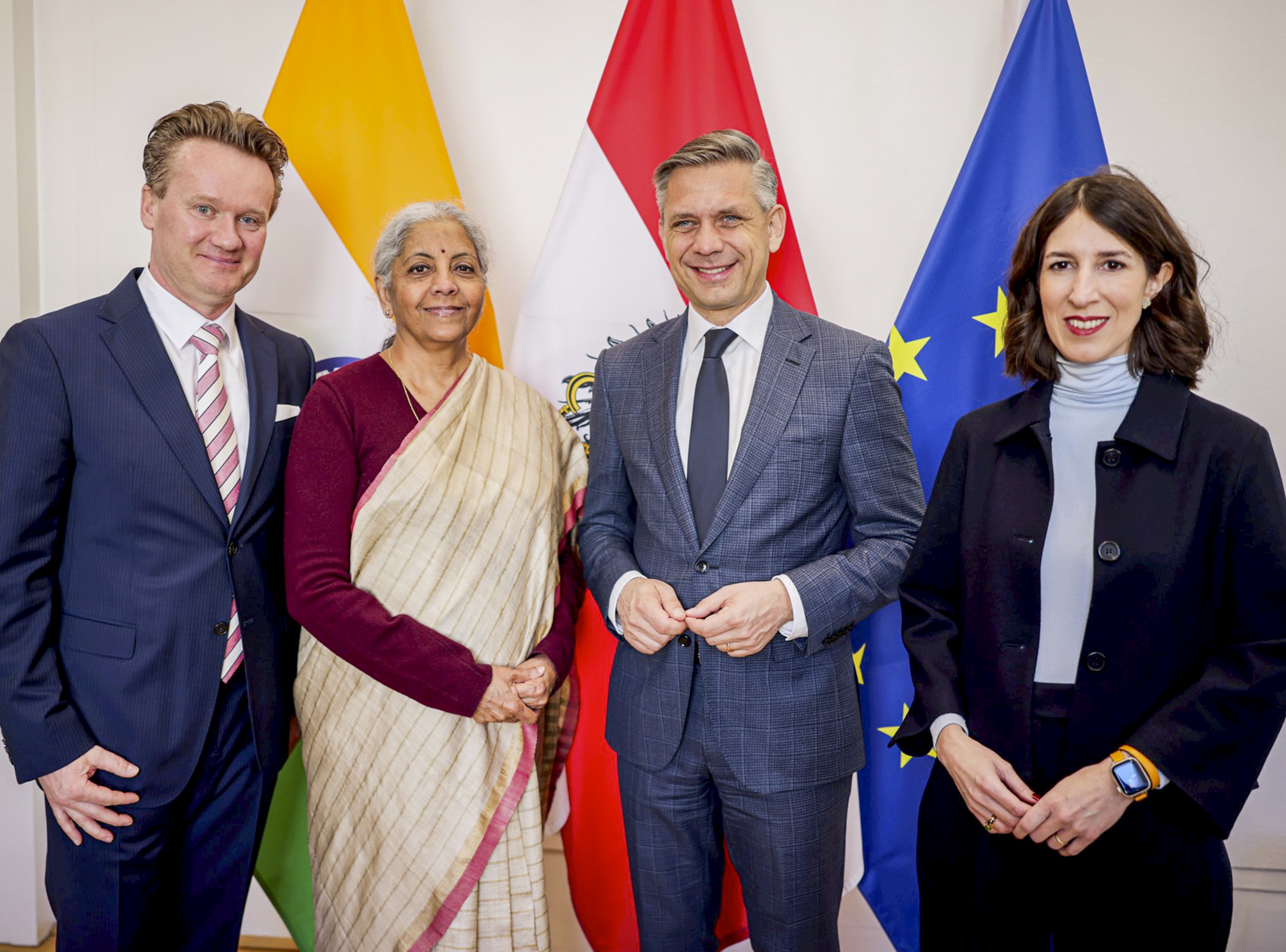 **EDS: THIRD PARTY IMAGE** In this image posted by @FinMinIndia on April 11, 2025, Union Finance Minister Nirmala Sitharaman during a meeting with Minister of Economy, Energy and Tourism of Austria Wolfgang Hattmannsdorfer, Austrian Federal Economic Chamber Vice President Amelie Gross, and President of Federation of Austrian Industries Georg Knill, in Vienna, Austria. (@FinMinIndia on X via PTI Photo) (PTI04_11_2025_000412B)