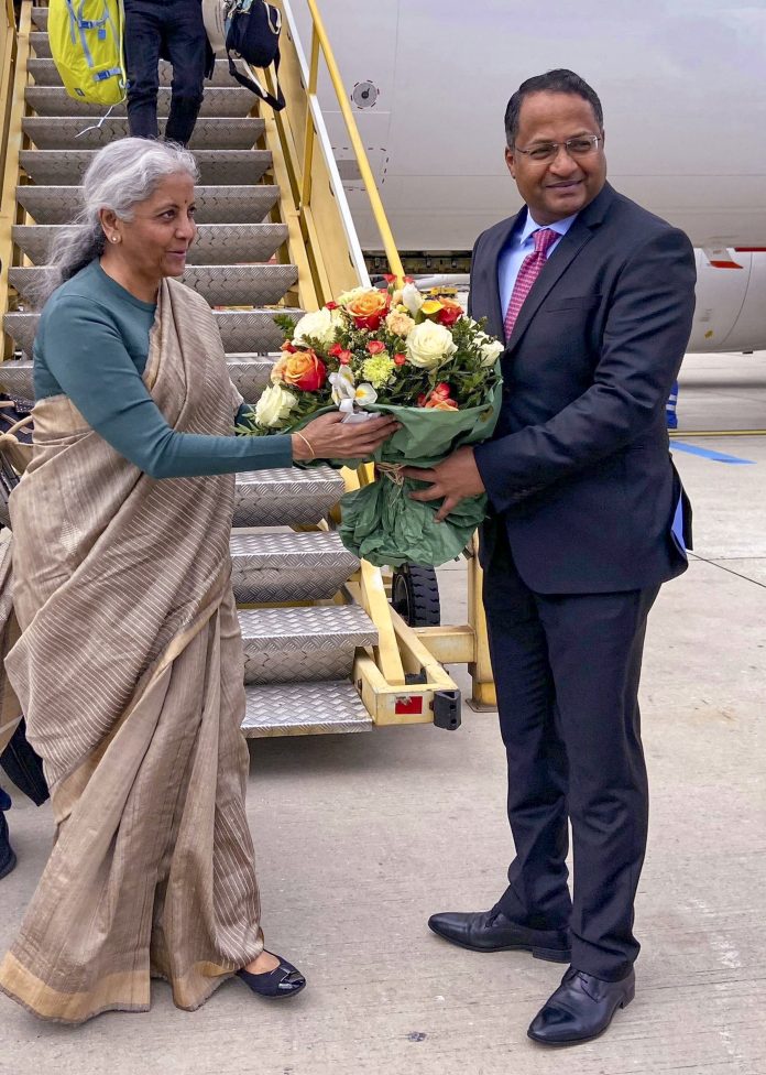 **EDS: THIRD PARTY IMAGE** In this image posted by @FinMinIndia via X on April 10, 2025, Union Finance Minister Nirmala Sitharaman being received by Ambassador of India to Austria Shambhu S Kumaran upon her arrival in Vienna, Austria. (@FinMinIndia on X via PTI Photo) (PTI04_10_2025_000225B)