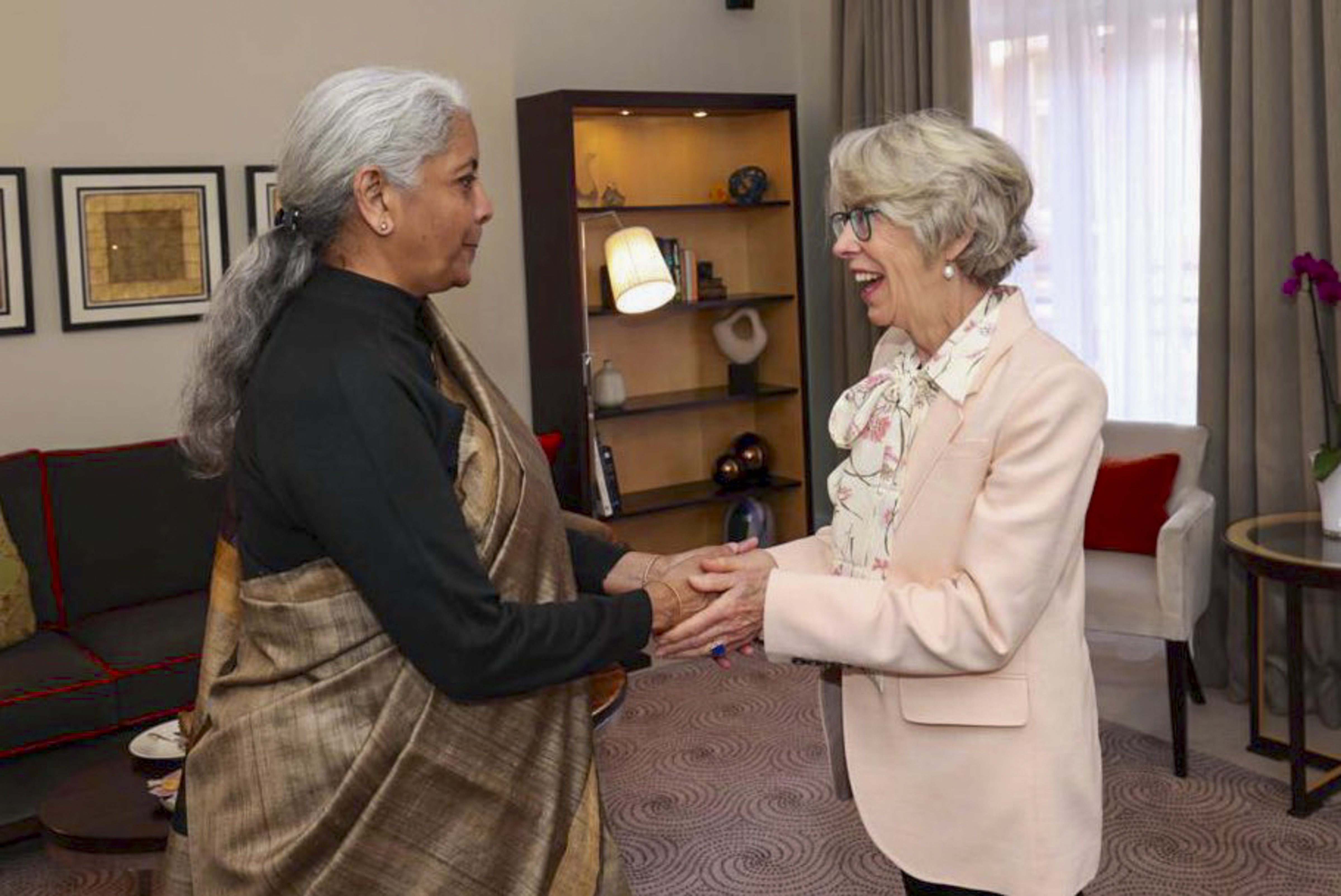 **EDS: THIRD PARTY IMAGE** In this image released by @FinMinIndia via X on April 8, 2025, Union Finance Minister Nirmala Sitharaman with Former Health Secretary of the UK and former Chair of the UK India Business Council Dame Patricia Hewitt during a meeting, in London. (@FinMinIndia via PTI Photo)(PTI04_08_2025_000301B) *** Local Caption ***