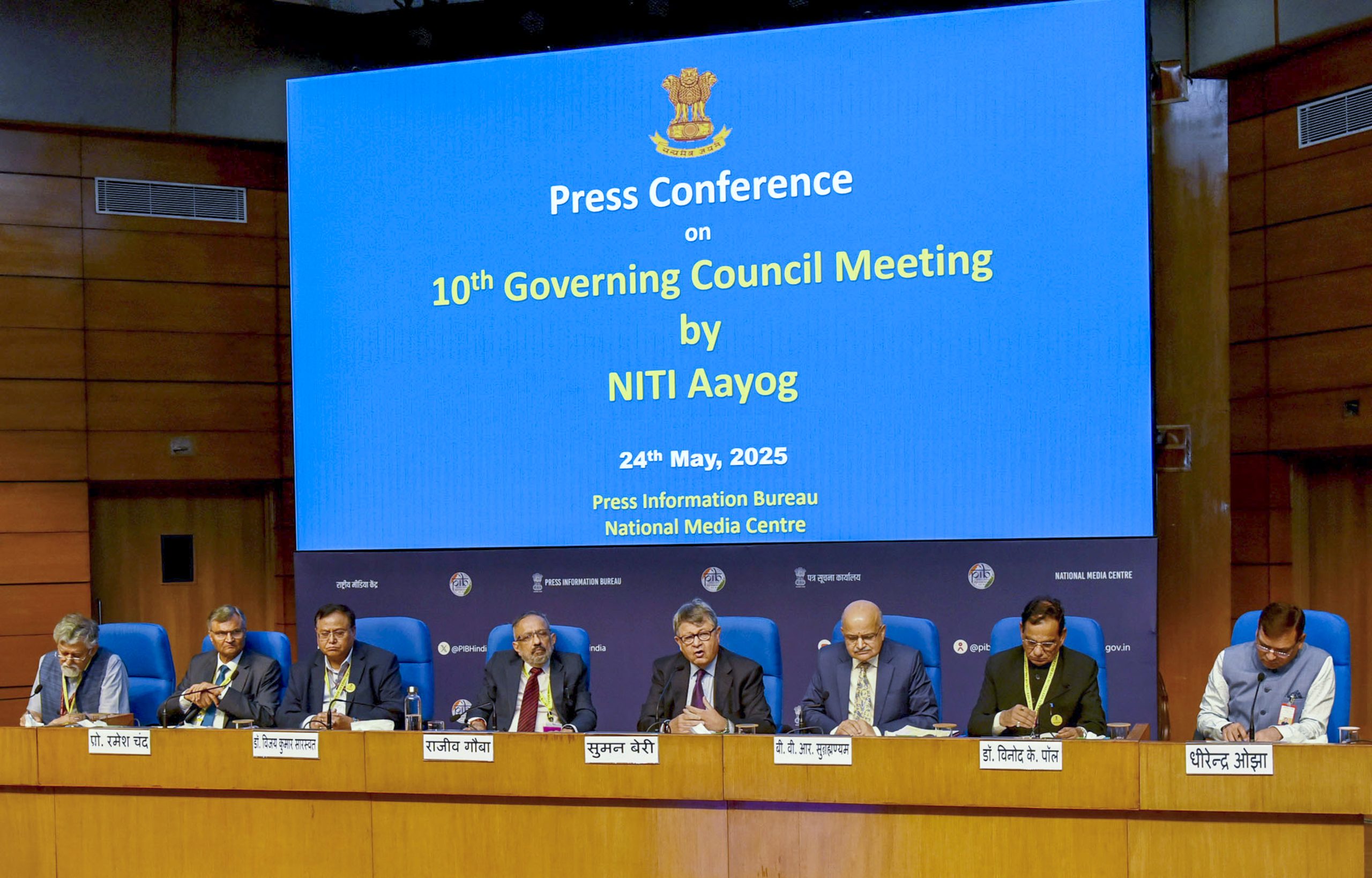 **EDS: THIRD PARTY** In this image released by PIB on May 25, 2025, NITI Aayog Vice-Chairperson Suman Bery addresses a press conference on the 10th Governing Council Meeting of NITI Aayog at National Media Centre, in New Delhi. (PIB via PTI Photo) (PTI05_25_2025_000277B)