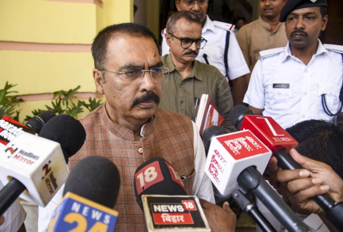 Patna: Bihar BJP President Sanjay Saraogi speaks to the media about the resignation of Chief Minister Nitish Kumar from the Legislative Council, at Bihar Vidhan Sabha, in Patna, Monday, March 30, 2026. (PTI Photo)(PTI03_30_2026_000038B)