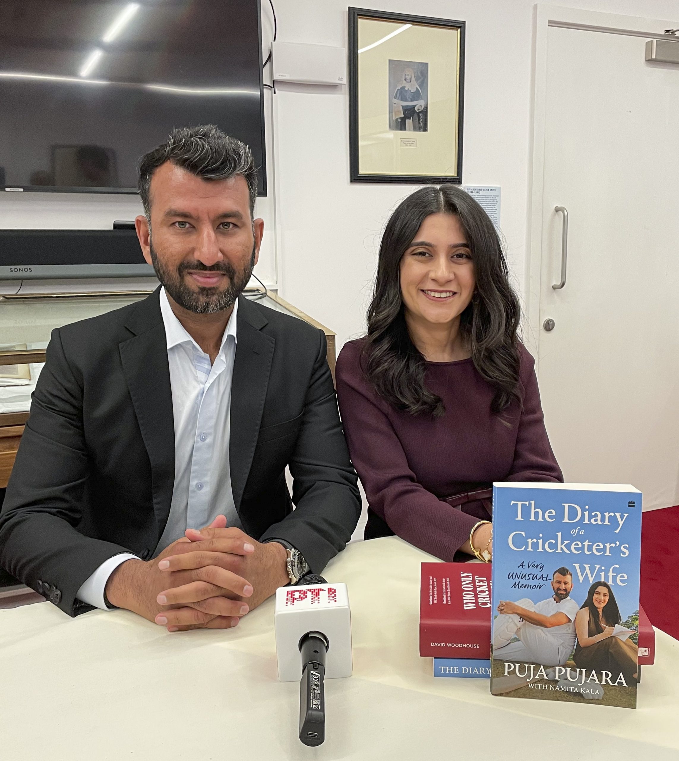 **EDS: TO GO WITH STORY** London: Indian cricketer Cheteshwar Pujara with his wife Puja, author of ‘The Diary of a Cricketer’s Wife’, at the presentation of the memoir for the Lord's Cricket Ground library during a London book tour this week. (PTI Photo) (PTI07_19_2025_000129B)