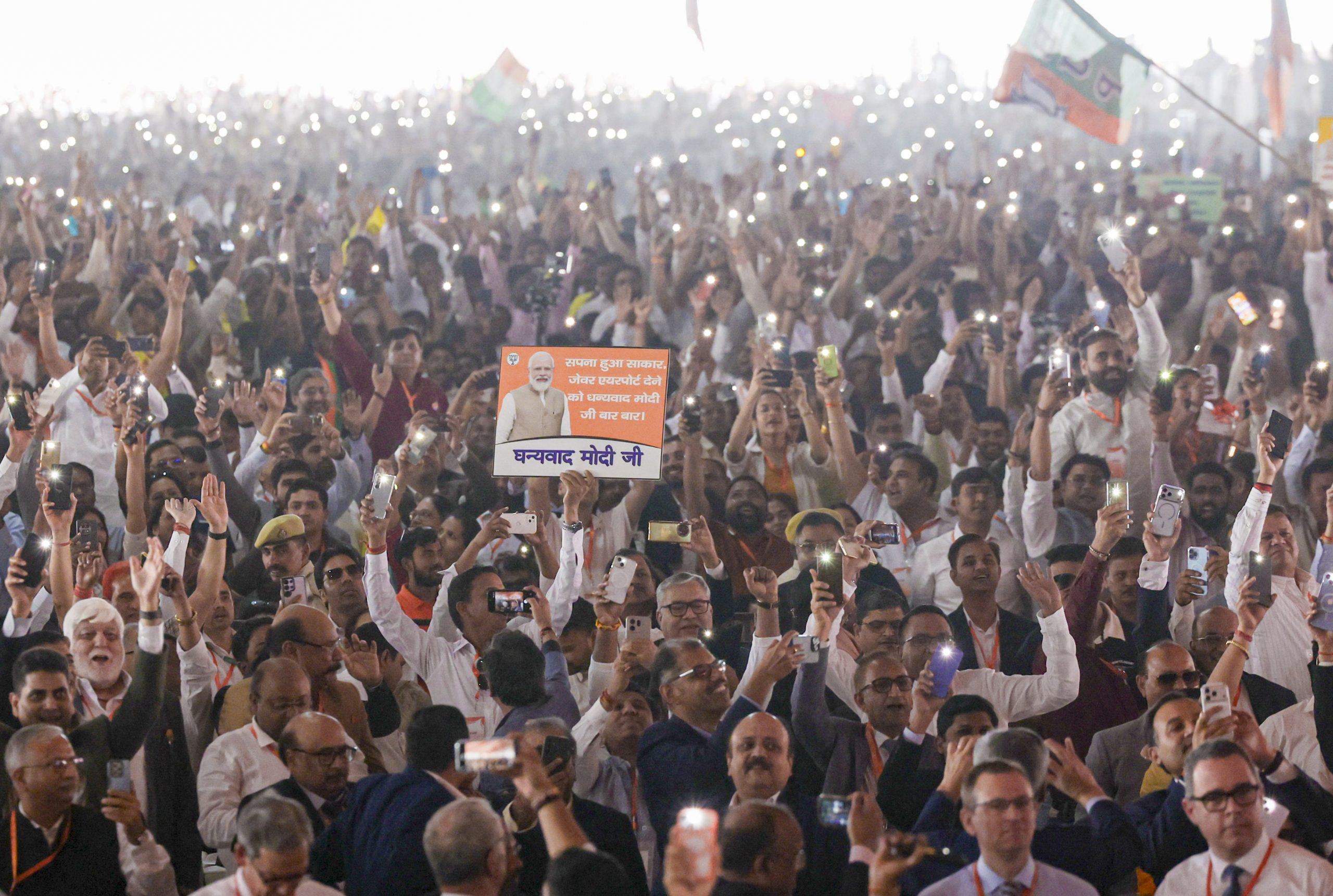 **EDS: THIRD PARTY IMAGE** In this image received on March 28, 2026, People hold a placard of Prime Minister Narendra Modi and light up mobile phone torches during inauguration of the newly constructed Noida International Airport, in Noida, Uttar Pradesh. (PMO via PTI Photo)(PTI03_28_2026_000116B)