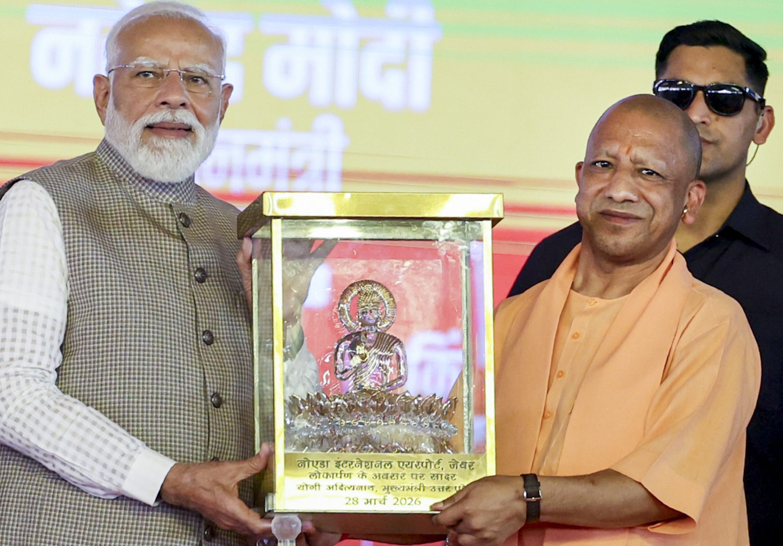 **EDS: THIRD PARTY IMAGE** In this image received on March 28, 2026, Prime Minister Narendra Modi being felicitated by Uttar Pradesh Chief Minister Yogi Adityanath during inauguration of the newly constructed Noida International Airport, in Jewar, Gautam Buddha Nagar district, Uttar Pradesh. (PMO via PTI Photo)(PTI03_28_2026_000124B)