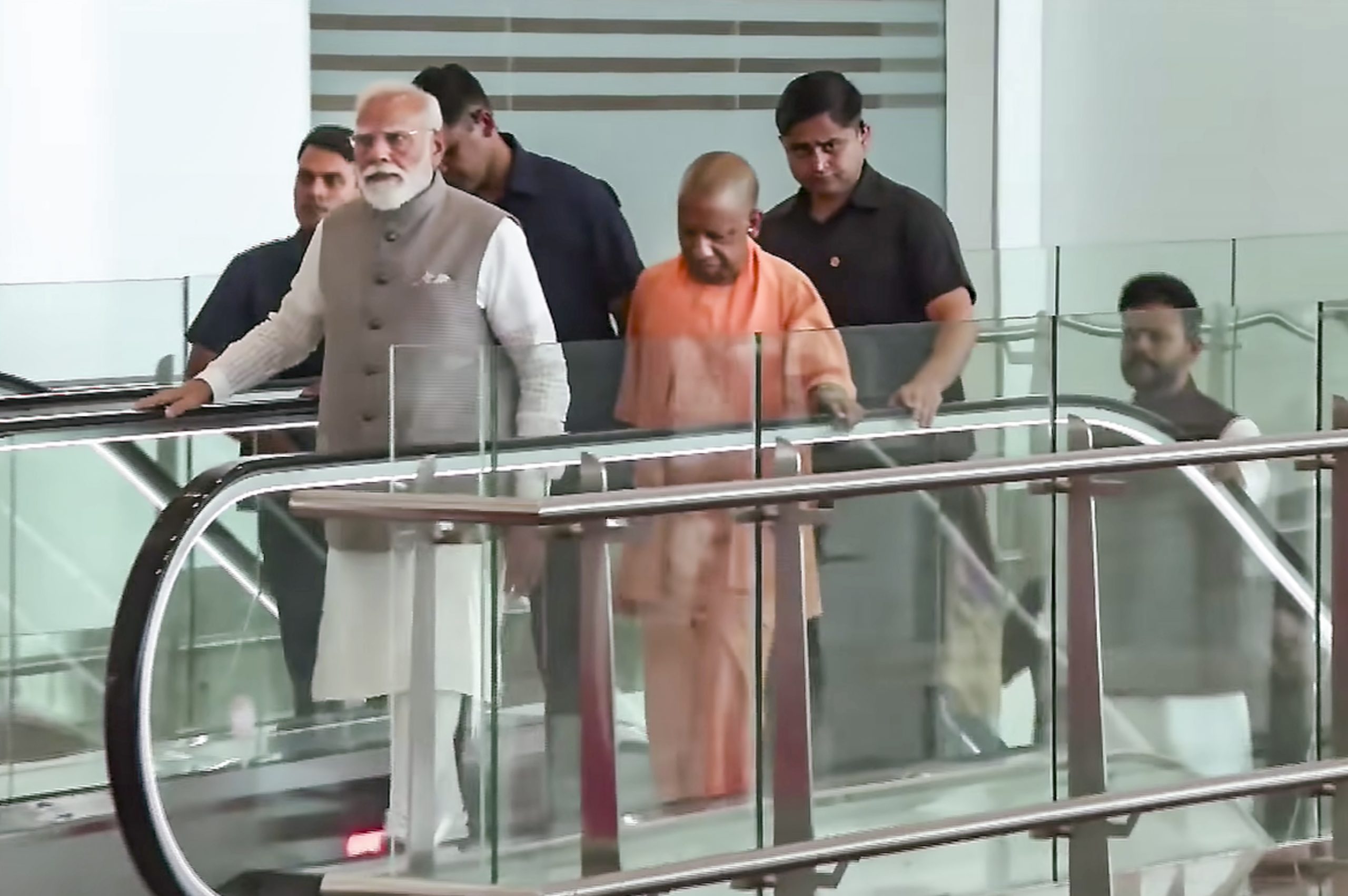 **EDS: THIRD PARTY IMAGE** In this screengrab from a video posted on March 28, 2026, Prime Minister Narendra Modi with Union Civil Aviation Minister Kinjarapu Ram Mohan Naidu, Uttar Pradesh Chief Minister Yogi Adityanath, and others, during inauguration of the newly constructed Noida International Airport, in Noida, Uttar Pradesh. (@NarendraModi/YT via PTI Photo)(PTI03_28_2026_000038B)