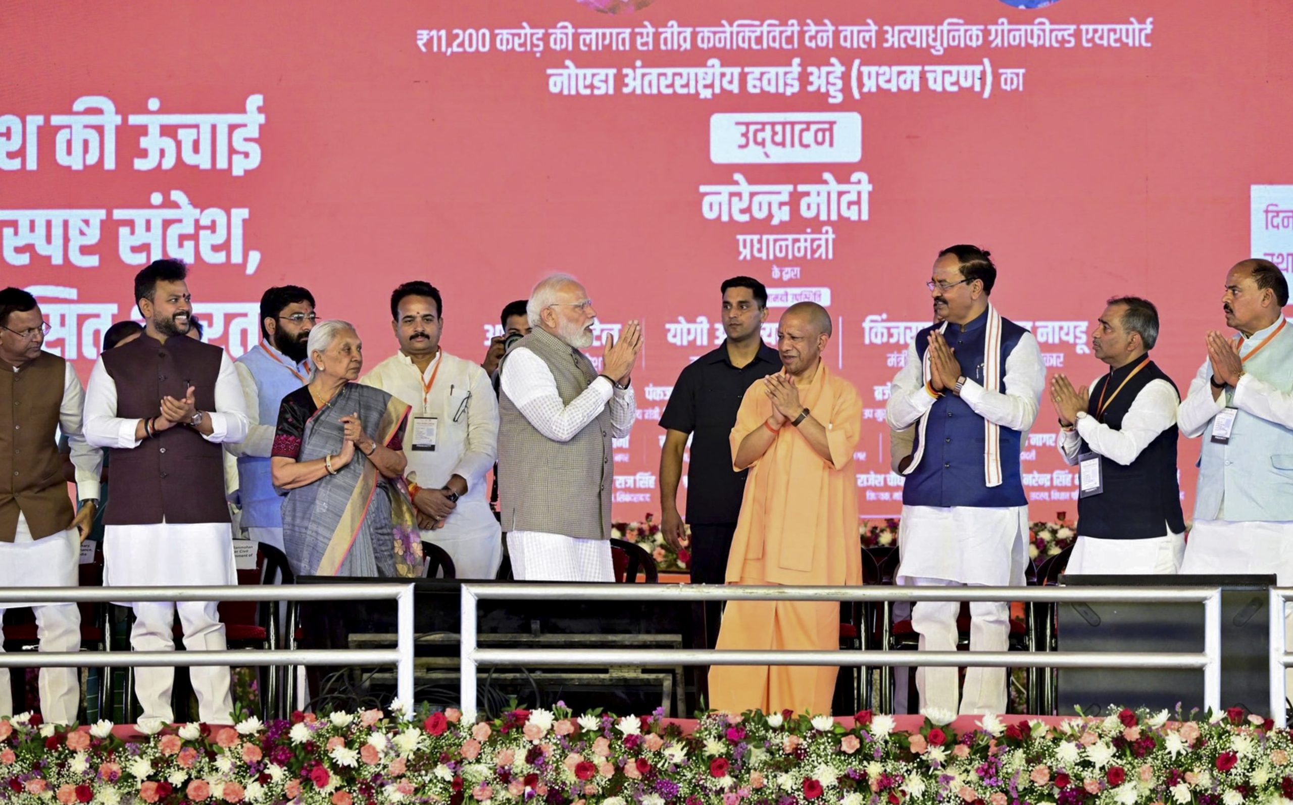 **EDS: THIRD PARTY IMAGE** In this image posted on March 28, 2026, Prime Minister Narendra Modi with Union Civil Aviation Minister Kinjarapu Ram Mohan Naidu, Uttar Pradesh Chief Minister Yogi Adityanath, Deputy CM Keshav Prasad Maurya, Governor Anandiben Patel, and others, during inauguration of the Noida International Airport, in Jewar, Gautam Buddha Nagar district, Uttar Pradesh. (@kpmaurya1/X via PTI Photo)(PTI03_28_2026_000132B)