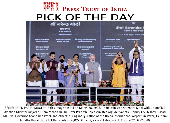 PLS TAKE NOTE OF THIS PTI PICK OF THE DAY::: **EDS: THIRD PARTY IMAGE** In this image posted on March 28, 2026, Prime Minister Narendra Modi with Union Civil Aviation Minister Kinjarapu Ram Mohan Naidu, Uttar Pradesh Chief Minister Yogi Adityanath, Deputy CM Keshav Prasad Maurya, Governor Anandiben Patel, and others, during inauguration of the Noida International Airport, in Jewar, Gautam Buddha Nagar district, Uttar Pradesh. (@CMOfficeUP/X via PTI Photo)(PTI03_28_2026_000138B)(PTI03_28_2026_000277B)