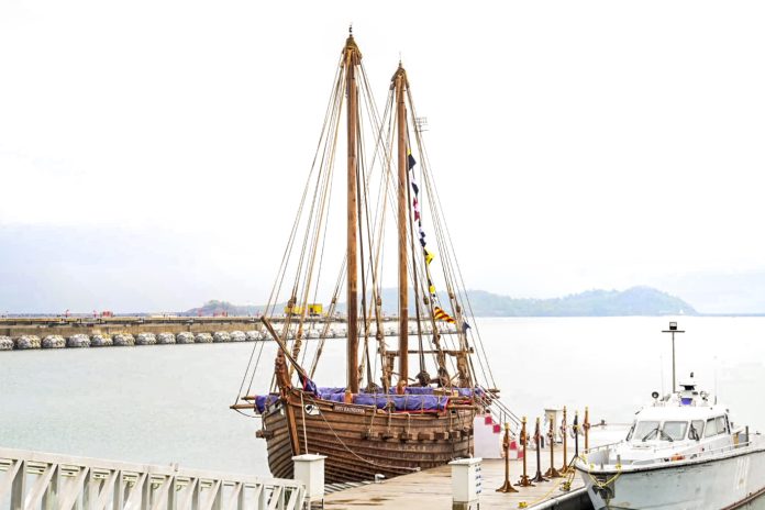 **EDS: THIRD PARTY IMAGE TO GO WITH STORY** In this image posted by PIB on May 21, 2025, INSV Kaundinya, a recreation of a 5th-century stitched ship inspired by Ajanta murals, during its induction ceremony at the Karwar Naval Base, Karnataka. (PIB via PTI Photo) (PTI05_21_2025_000300B)