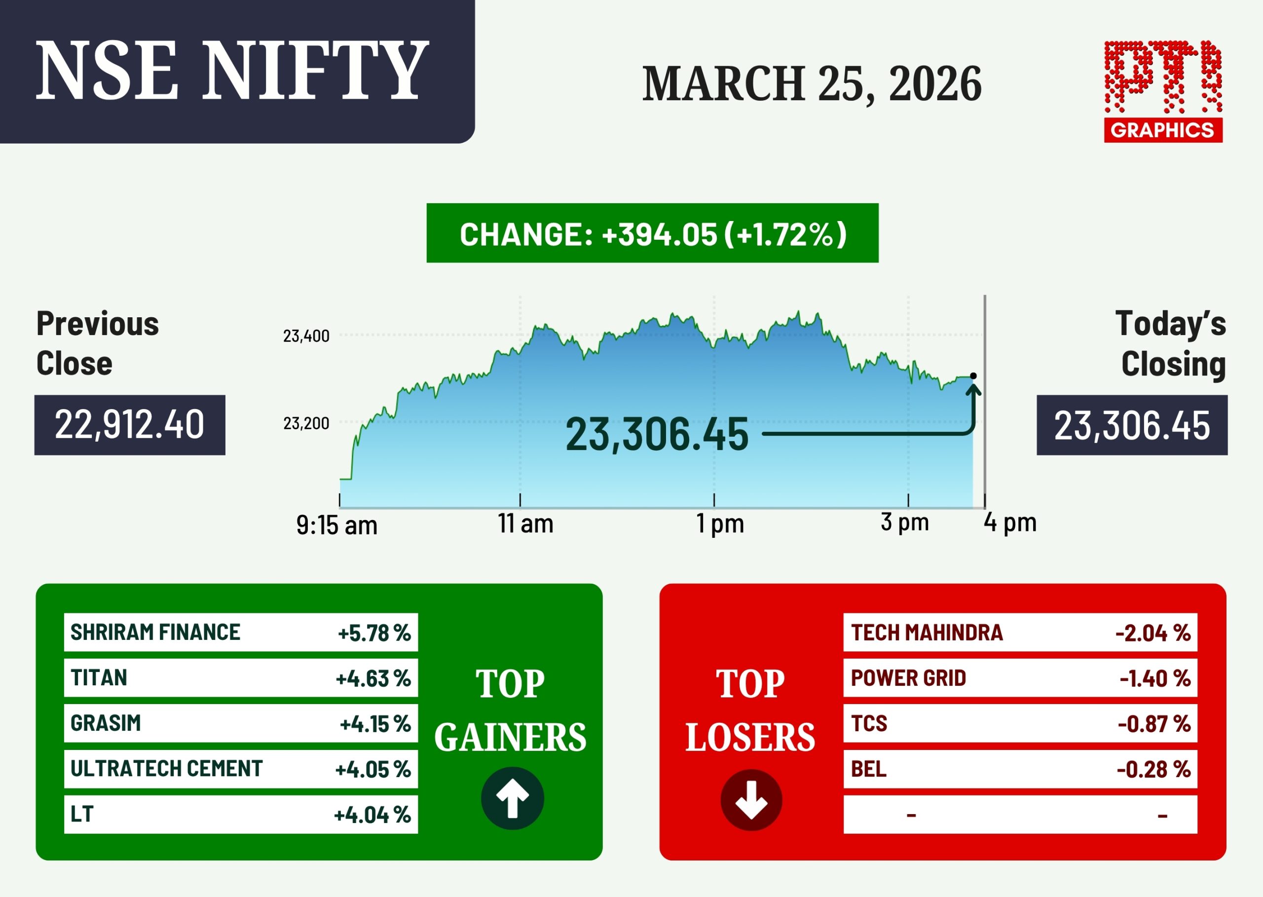 NSE Nifty March 25, 2026 FacebookTwitterPinterestWhatsApp NEW DELHI: NSE NIFTY. PTI GRAPHICS.(PTI03_25_2026_001010003B) NSE Nifty NEW DELHI: NSE NIFTY. PTI GRAPHICS.(PTI03_25_2026_001010003B)