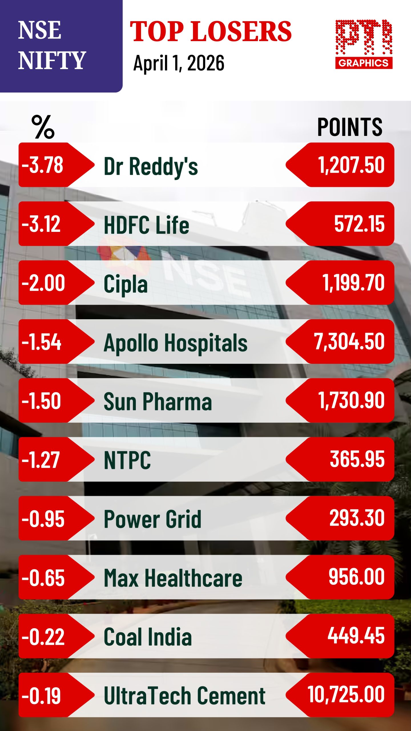 NSE Nifty Top Losers April 1, 2026 FacebookTwitterPinterestWhatsApp NEW DELHI: NSE NIFTY TOP LOSERS. PTI GRAPHICS.(PTI04_01_2026_001010006B) NSE Nifty Top Losers NEW DELHI: NSE NIFTY TOP LOSERS. PTI GRAPHICS.(PTI04_01_2026_001010006B)