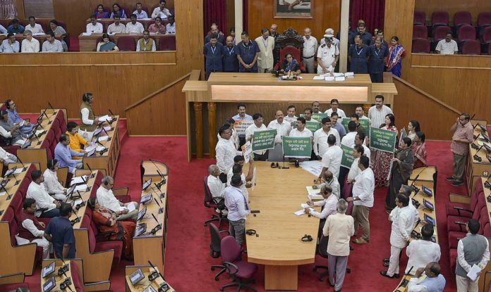 Bhubaneswar: BJD and other leaders stage a protest demanding the resignation of Odisha Health Minister Mukesh Mahaling over the fire incident at SCB Medical College and Hospital, during the Budget session of state Assembly, in Bhubaneswar, Odisha, Thursday, March 26, 2026. (PTI Photo) (PTI03_26_2026_000220B)