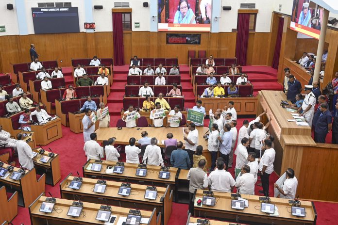 Bhubaneswar: BJD and other leaders stage a protest demanding the resignation of Odisha Health Minister Mukesh Mahaling over the fire incident at SCB Medical College and Hospital, during the Budget session of state Assembly, in Bhubaneswar, Odisha, Thursday, March 26, 2026. (PTI Photo) (PTI03_26_2026_000219B)