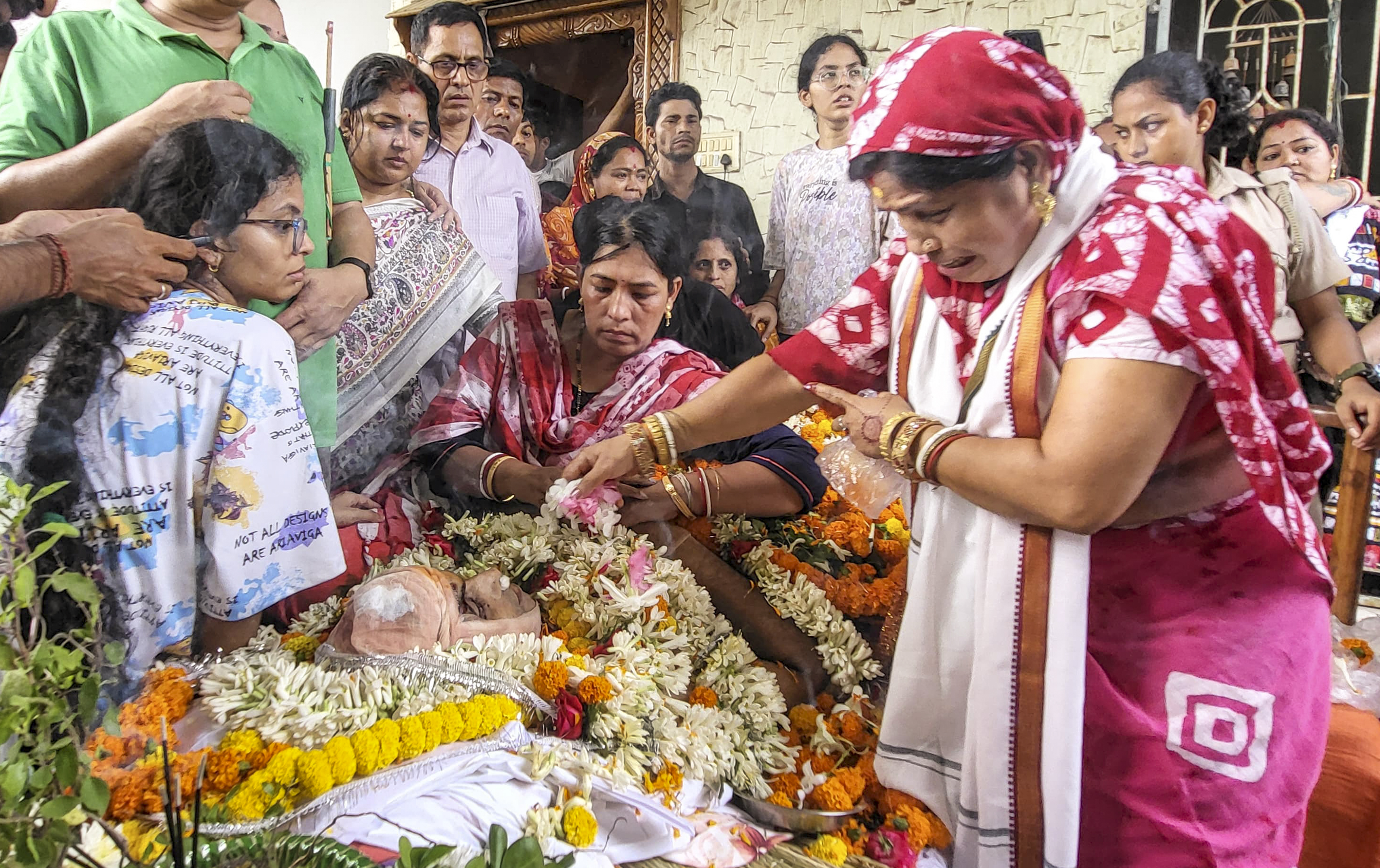 Balasore: Family members of Prashant Satpathy, who was killed in the Pahalgam terror attack, pay their last respects to him before his last rites at Ishani village in Balasore district, Odisha, Thursday, April 24, 2025. (PTI Photo) (PTI04_24_2025_000278B)