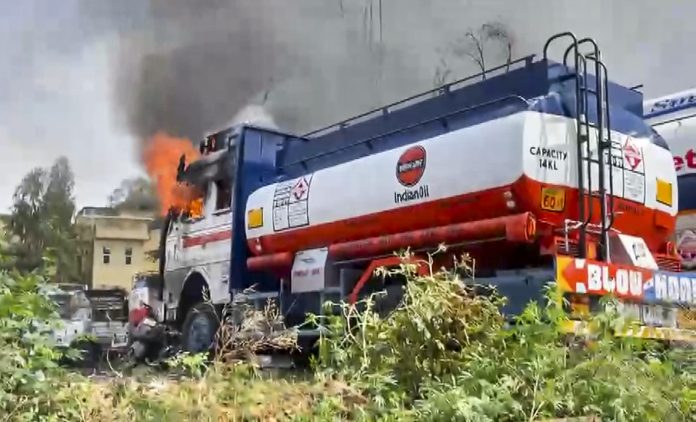 **EDS: SCREENGRAB VIA PTI VIDEOS** Jammu: An oil tanker stands engulfed in flames, in Jammu, Wednesday, April 1, 2026. The fire broke out under mysterious circumstances in one tanker and rapidly spread to four or five other tankers, according to officials. (PTI Photo)(PTI04_01_2026_000231B)