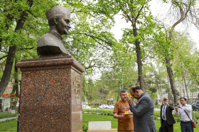 **EDS: THIRD PARTY IMAGE** In this image released by @ombirlakota via X on Monday, April 7, 2025, Lok Sabha Speaker Om Birla pays tribute at a bust of former prime minister Lal Bahadur Shastri in Tashkent, Uzbekistan. (@ombirlakota on X via PTI Photo)(PTI04_07_2025_000418B)