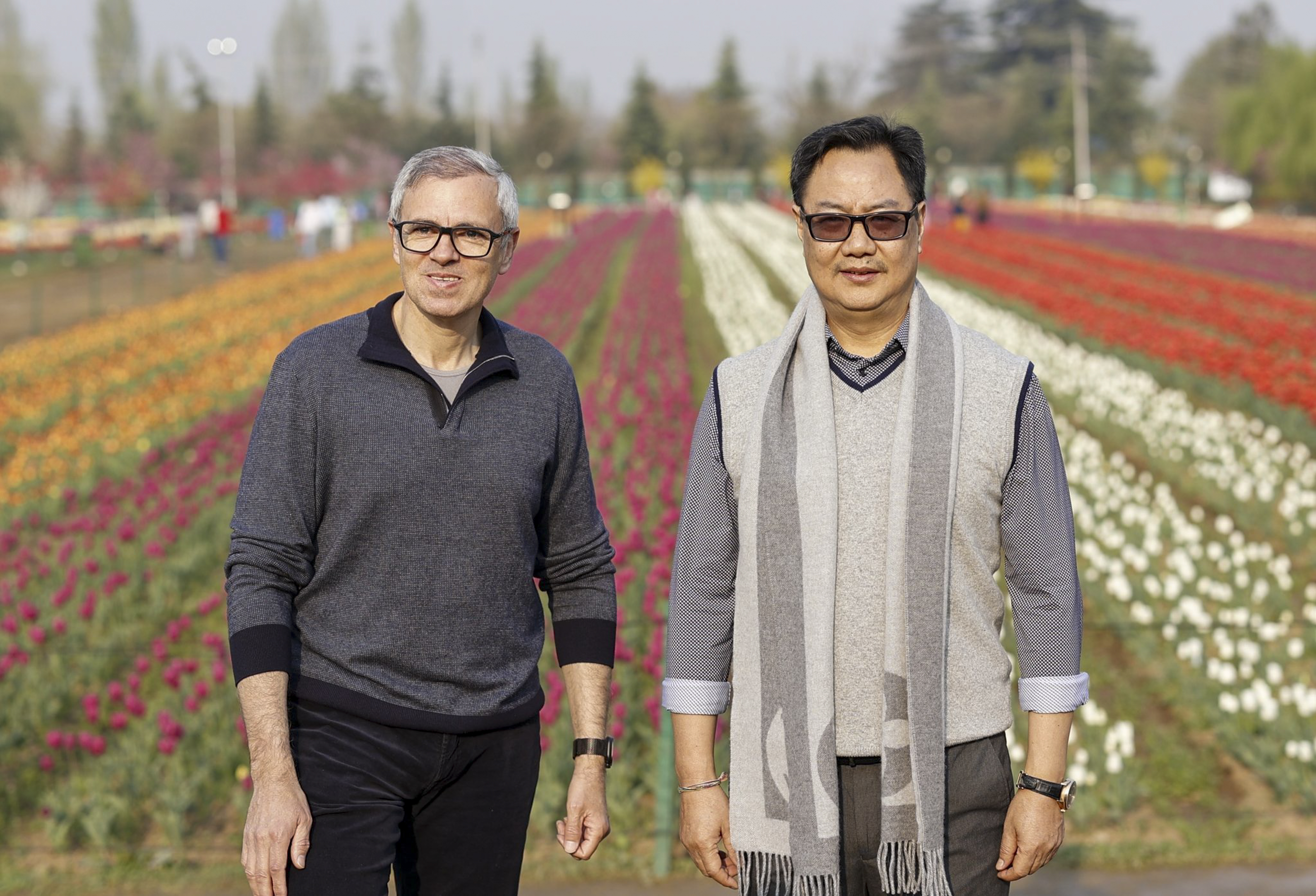 **EDS: THIRD PARTY IMAGE** In this image released by @KirenRijiju via X on April 7, 2025, Union Minister Kiren Rijiju with Jammu & Kashmir Chief Minister Omar Abdullah during a visit to the Indira Gandhi Memorial Tulip Garden, in Srinagar. (@KirenRijiju via PTI Photo)(PTI04_07_2025_000057B)