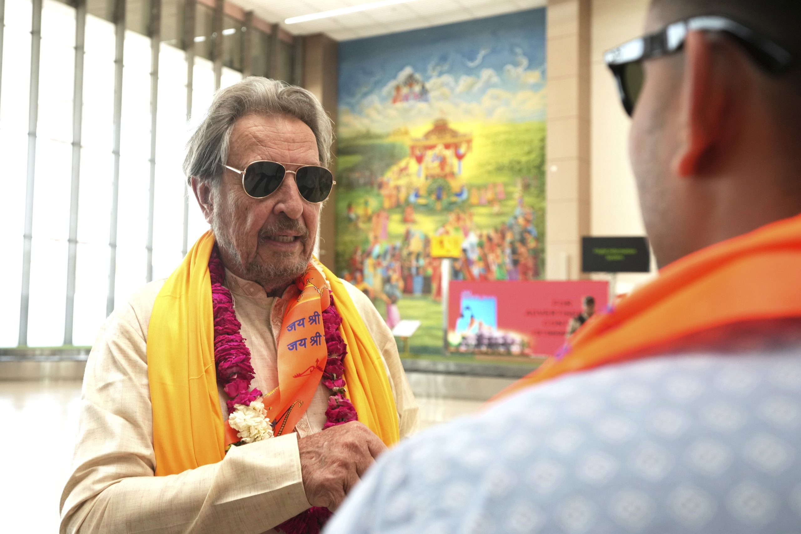 Elon Musk's father Errol Musk is welcomed at the airport upon his arrival in Ayodhya, India, Wednesday, June 4, 2025. AP/PTI(AP06_04_2025_000443B)