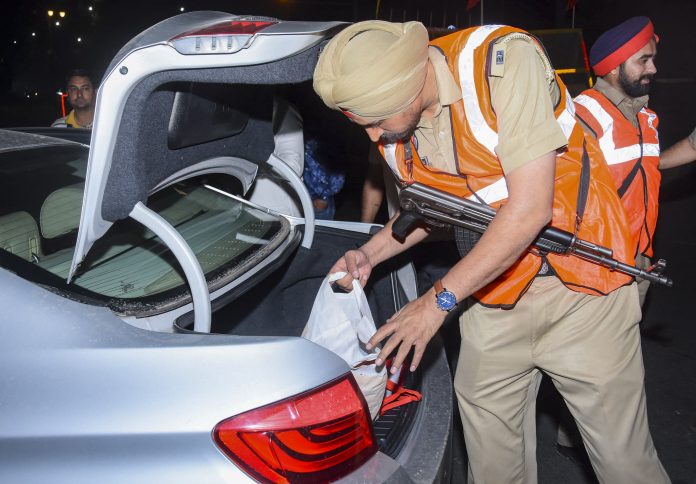 Amritsar: Police personnel check a vehicle during a late-night inspection under operation ‘Satark�, in Amritsar, Friday, April 11, 2025. (PTI Photo) (PTI04_12_2025_000076B)