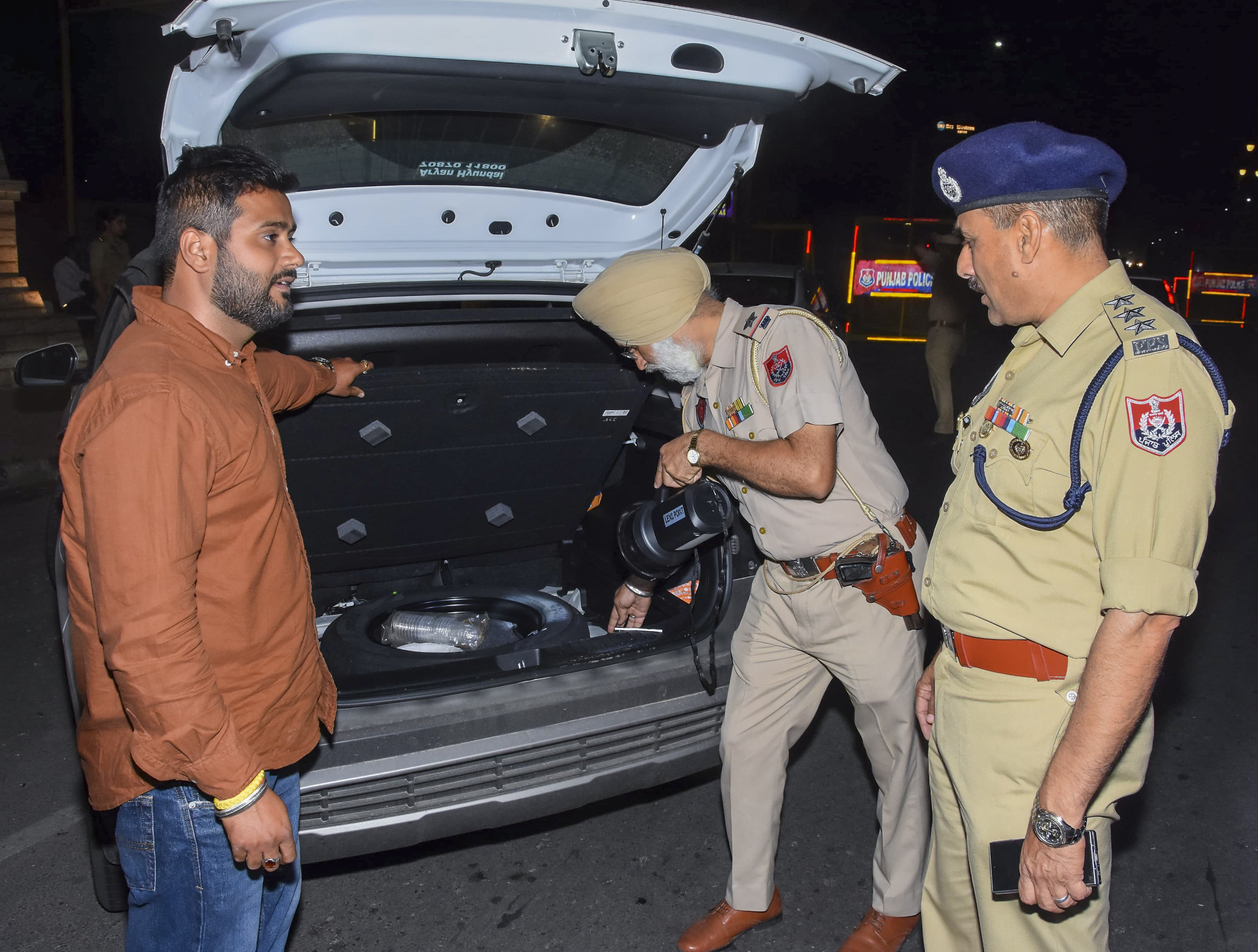Amritsar: Police personnel check a vehicle during a late-night inspection under operation ‘Satark�, in Amritsar, Friday, April 11, 2025. (PTI Photo) (PTI04_12_2025_000079B)