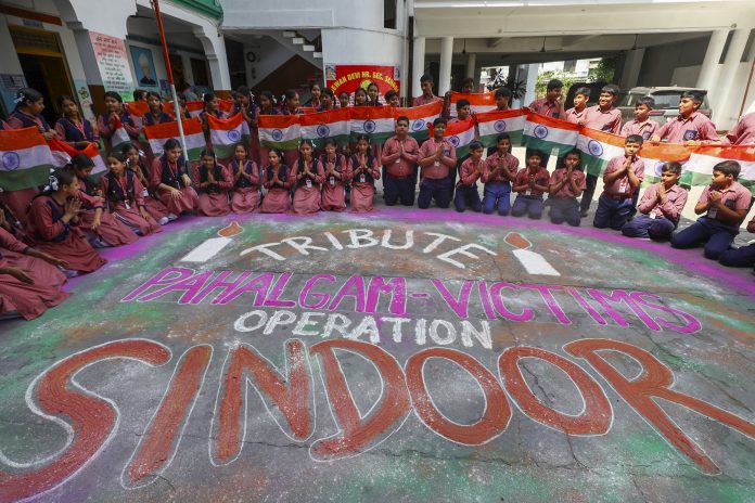Jammu: Students poses for pictures after making a rangoli to pay tribute to Pahalgam terror attack victims marking one month of the incident and to hail the Indian armed forces' Operation Sindoor, in Jammu, Thursday, May 22, 2025. (PTI Photo)(PTI05_22_2025_000135B)