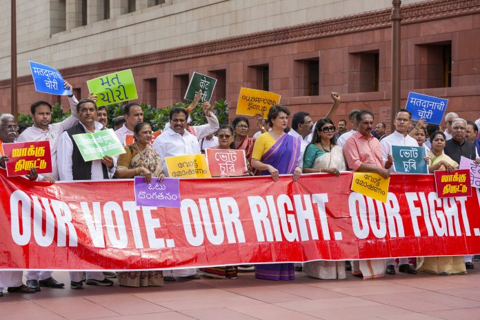 A banner in front of the protesting MPs read “Our Vote. Our Right. Our Fight”. Another banner carried by the protesting MPs read “SIR – Silent Invisible Rigging”.