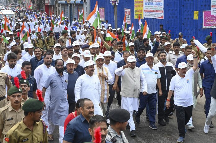 Patna: Union Sports Minister Mansukh Mandaviya with Bihar BJP President Dilip Jaishwal, Deputy CM Vijay Kumar Sinha, MP Ravishankar Prasad and others during ‘Jai Bhim Padyatra’ on the eve of 134th birth anniversary of Bharat Ratna Dr. B R Ambedkar, in Patna, Sunday, April 13, 2025. (PTI Photo) (PTI04_13_2025_000083B)