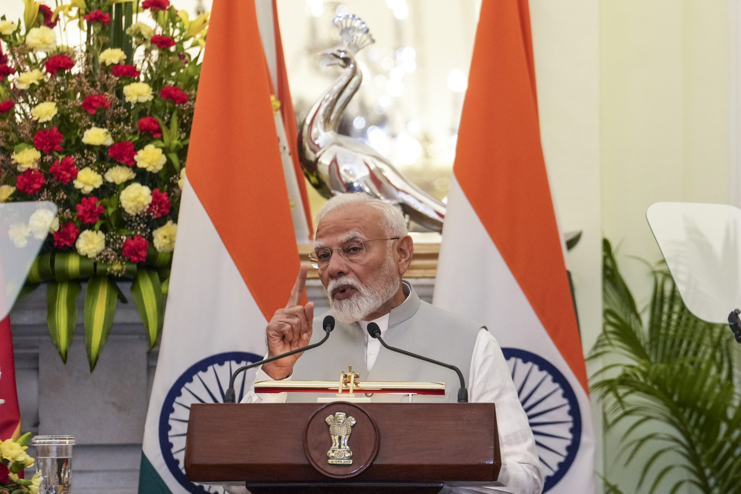 New Delhi: Prime Minister Narendra Modi addresses a joint press statement after delegation level meeting with the Angolan President Joao Manuel Goncalves Laurenco, at the Hyderabad House, in New Delhi, Saturday, May 3, 2025. (PTI Photo/Kamal Kishore) (PTI05_03_2025_000116B)