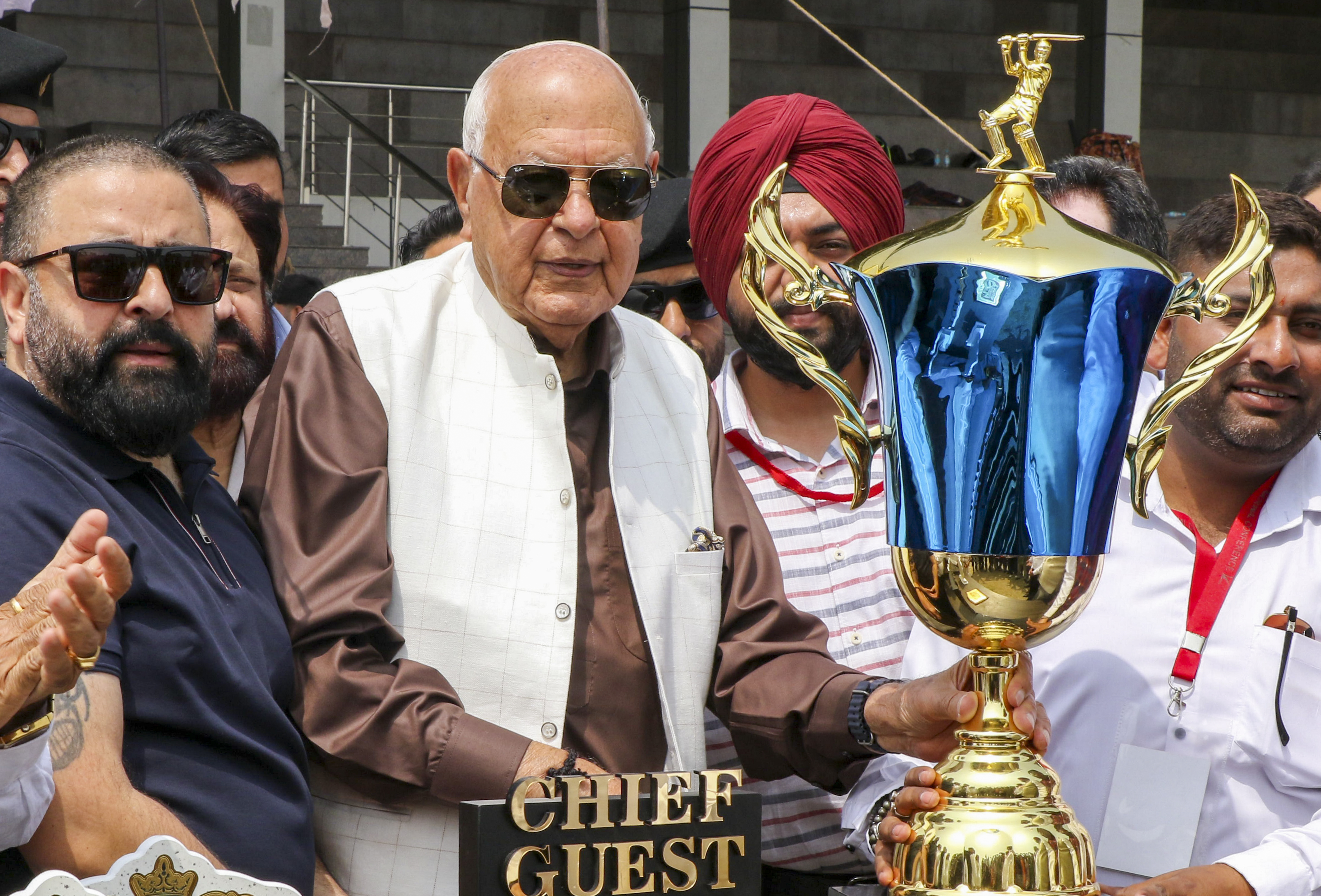 Jammu: J&K National Conference President Farooq Abdullah during Sher-E- Kashmir Cricket Tournament 2025, in Jammu, Monday, April 21, 2025. (PTI Photo)(PTI04_21_2025_000074B)