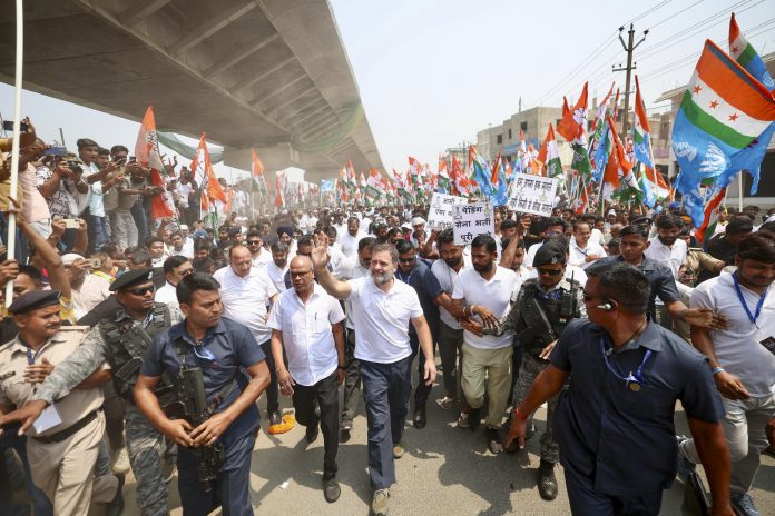 **EDS” THIRD PARTY** In this image posted by @INCIndia via X on April 7, 2025, Congress leader and LoP in the Lok Sabha Rahul Gandhi during the ‘Palayan Roko Naukri Do Yatra’, in Begusarai, Bihar. (@INCIndia via PTI Photo) (PTI04_07_2025_000032B)