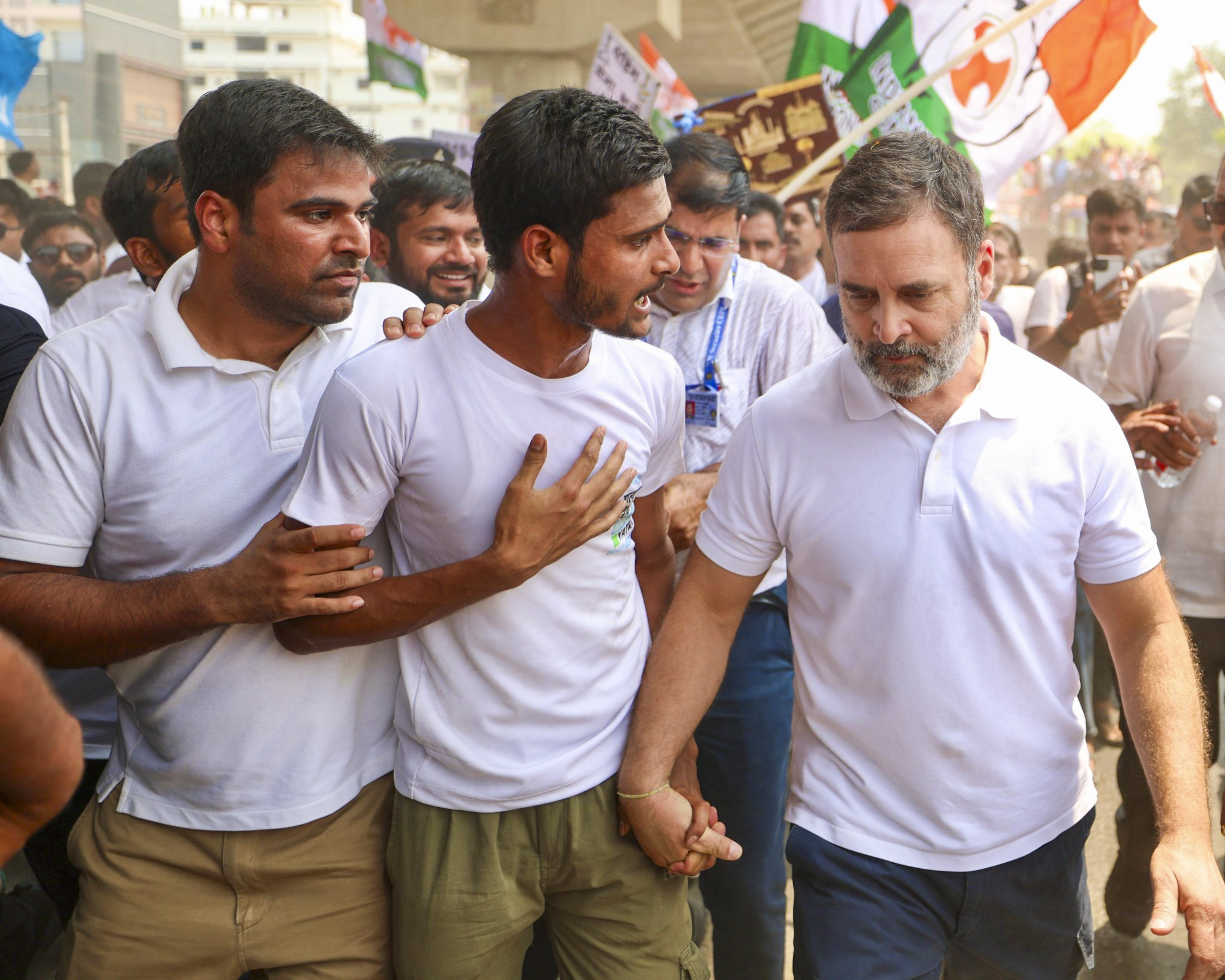 **EDS” THIRD PARTY** In this image posted by @INCIndia via X on April 7, 2025, Congress leader and LoP in the Lok Sabha Rahul Gandhi wearing a white T-shirt joins the Congress’ ‘Palayan Roko Naukri Do’ padyatra, in Begusarai, Bihar. (@INCIndia via PTI Photo) (PTI04_07_2025_000062B)