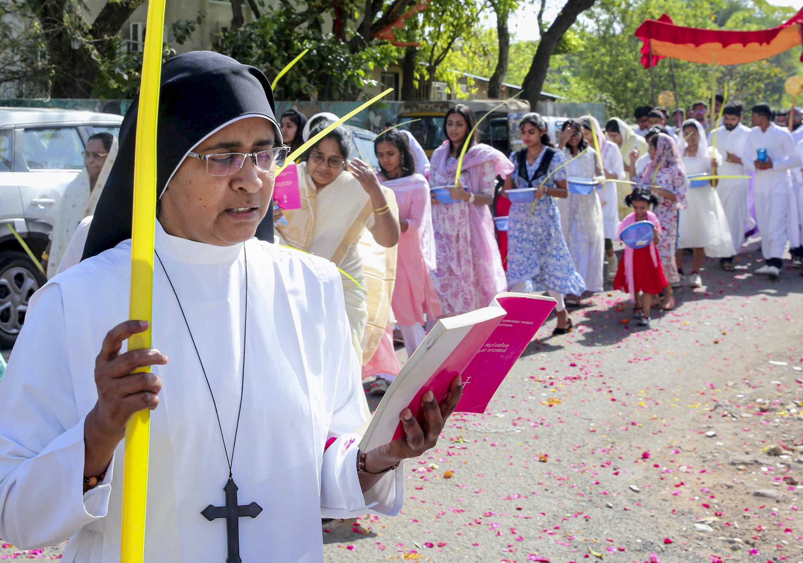 Bhopal: A nun reads from a holy book as Christians take part in a ceremony on the occassion of Palm Sunday, in Bhopal, Madhya Pradesh, Sunday, March 29, 2026. Palm Sunday marks the beginning of Holy Week and commemorates the entry of Jesus Christ into Jerusalem. (PTI Photo)(PTI03_29_2026_000048B)