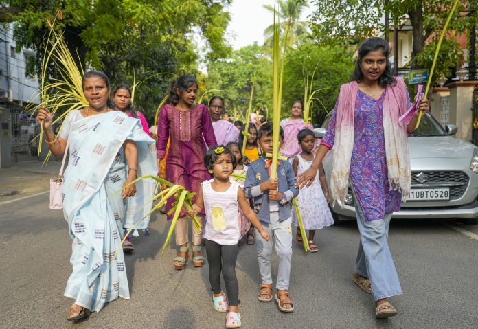 Chennai: Christians participate in a Palm Sunday procession in Chennai, Sunday, April 13, 2025. (PTI Photo/R Senthilkumar) (PTI04_13_2025_000062B)