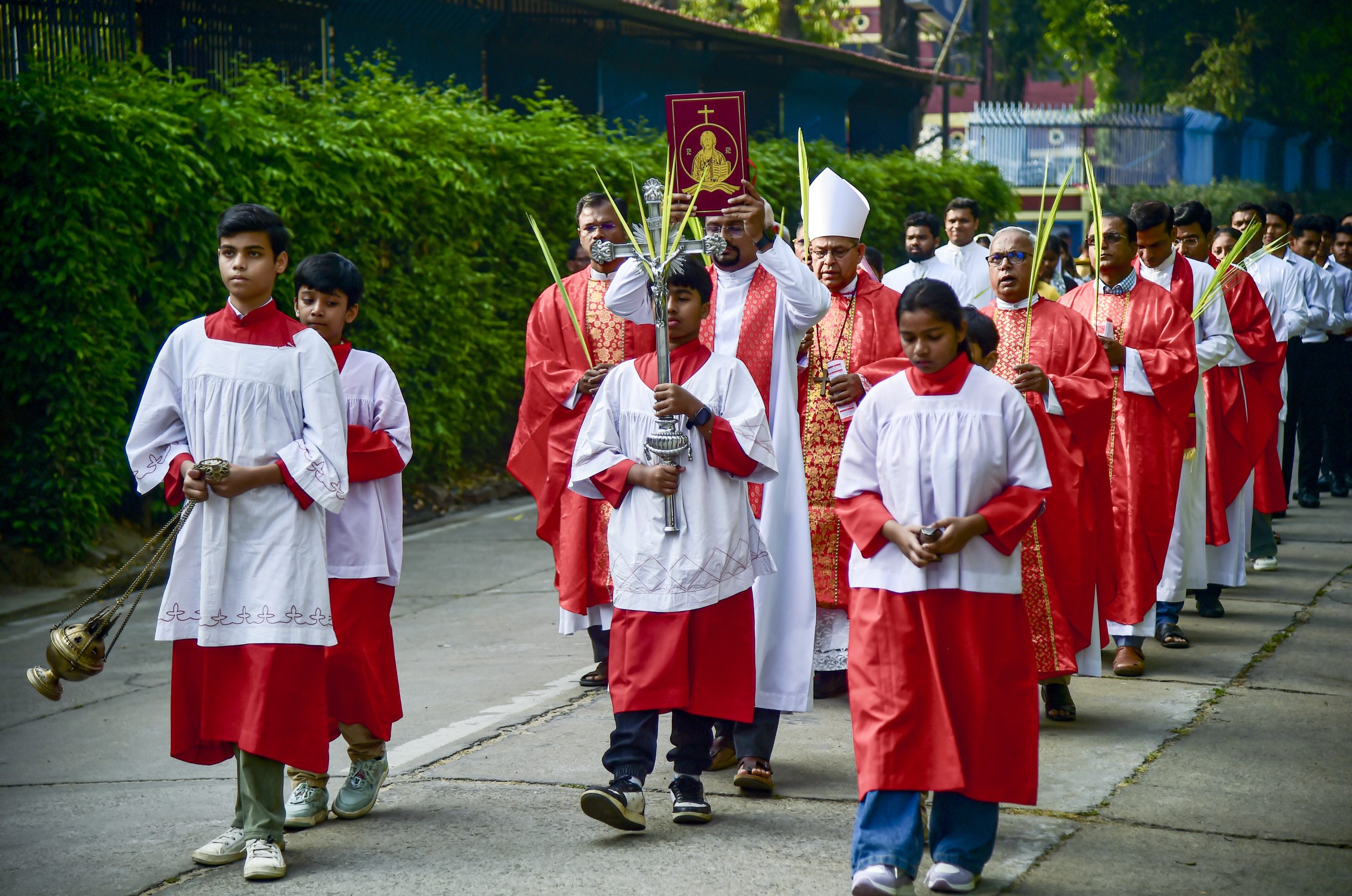 Prayagraj: Christians take part in a procession at the St. Joseph’s Cathedral Church on the occassion of Palm Sunday, in Prayagraj, Uttar Pradesh, Sunday, March 29, 2026. Palm Sunday marks the beginning of Holy Week and commemorates the entry of Jesus Christ into Jerusalem. (PTI Photo)(PTI03_29_2026_000022B)