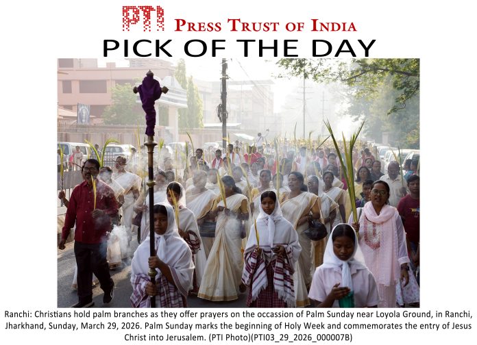 PLS TAKE NOTE OF THIS PTI PICK OF THE DAY::: Ranchi: Christians hold palm branches as they offer prayers on the occassion of Palm Sunday near Loyola Ground, in Ranchi, Jharkhand, Sunday, March 29, 2026. Palm Sunday marks the beginning of Holy Week and commemorates the entry of Jesus Christ into Jerusalem. (PTI Photo)(PTI03_29_2026_000007B)(PTI03_29_2026_000266B)