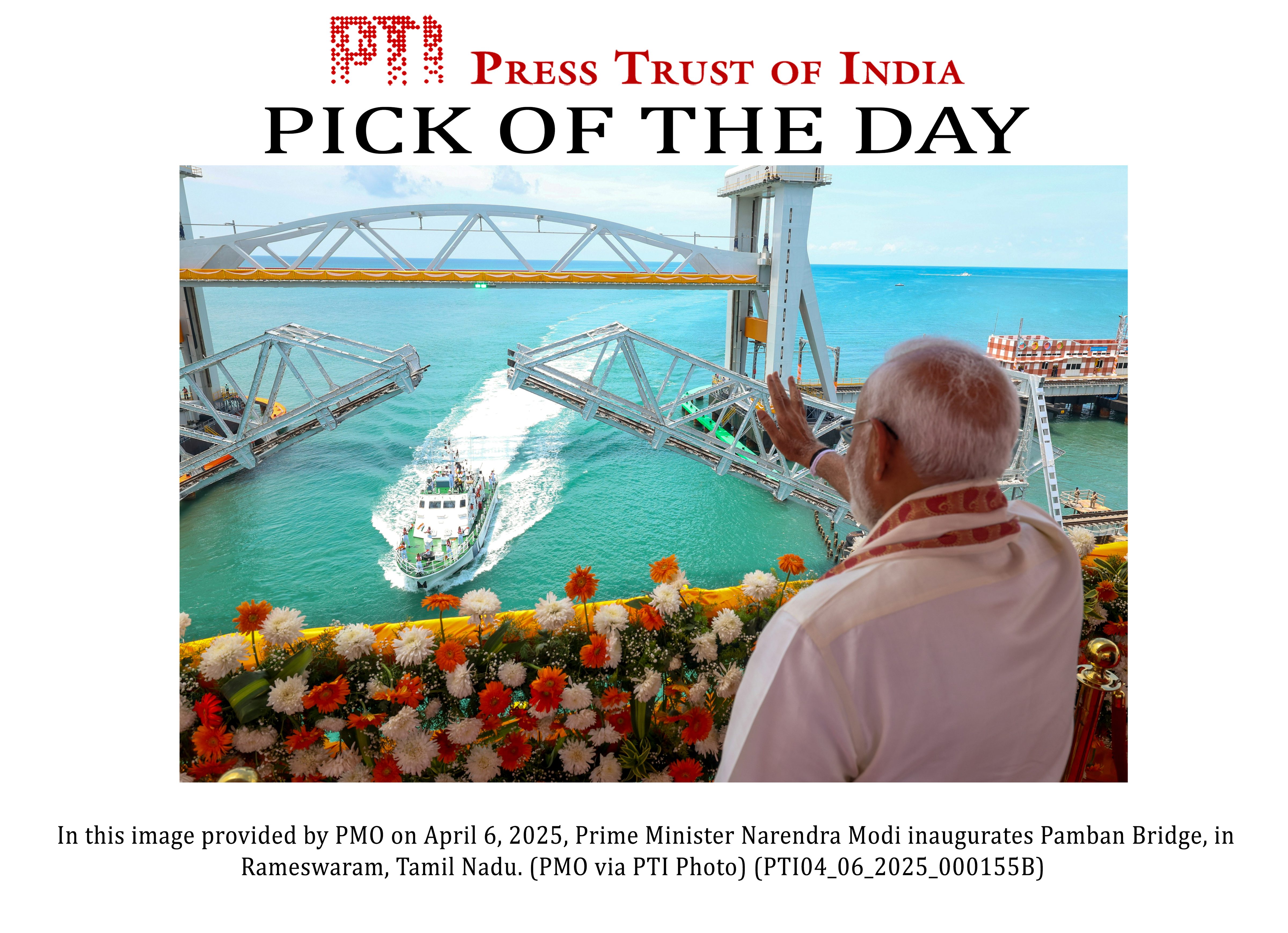 PLS TAKE NOTE OF THIS PTI PICK OF THE DAY:::**EDS: THIRD PARTY** In this image provided by PMO on April 6, 2025, Prime Minister Narendra Modi inaugurates Pamban Bridge, in Rameswaram, Tamil Nadu. (PMO via PTI Photo) (PTI04_06_2025_000155B)(PTI04_06_2025_000281B)