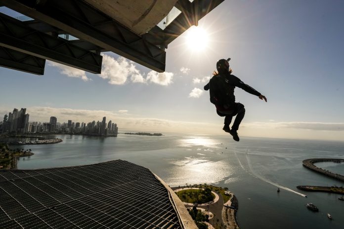 Base jumper Jack Propeck, from California, does a back flip as he leaps from a platform on 36th floor of The Sands building, an area adapted for base jumpers, in Panama City, Thursday morning, March 26, 2026. AP/PTI(AP03_26_2026_000395B)