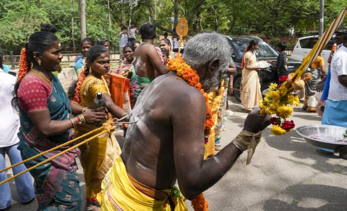 New Delhi: A devotee with pierced back takes part in a procession on the �Panguni Uthiram� festival, honouring the Hindu God Murugan in the Tamil month of Panguni, in New Delhi, Wednesday, April 1, 2026. (PTI Photo/Arun Sharma)(PTI04_01_2026_000292B)