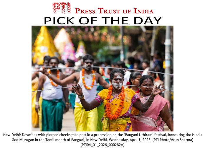 PLS TAKE NOTE OF THIS PTI PICK OF THE DAY::: New Delhi: Devotees with pierced cheeks take part in a procession on the �Panguni Uthiram� festival, honouring the Hindu God Murugan in the Tamil month of Panguni, in New Delhi, Wednesday, April 1, 2026. (PTI Photo/Arun Sharma)(PTI04_01_2026_000282A)(PTI04_01_2026_000391B)