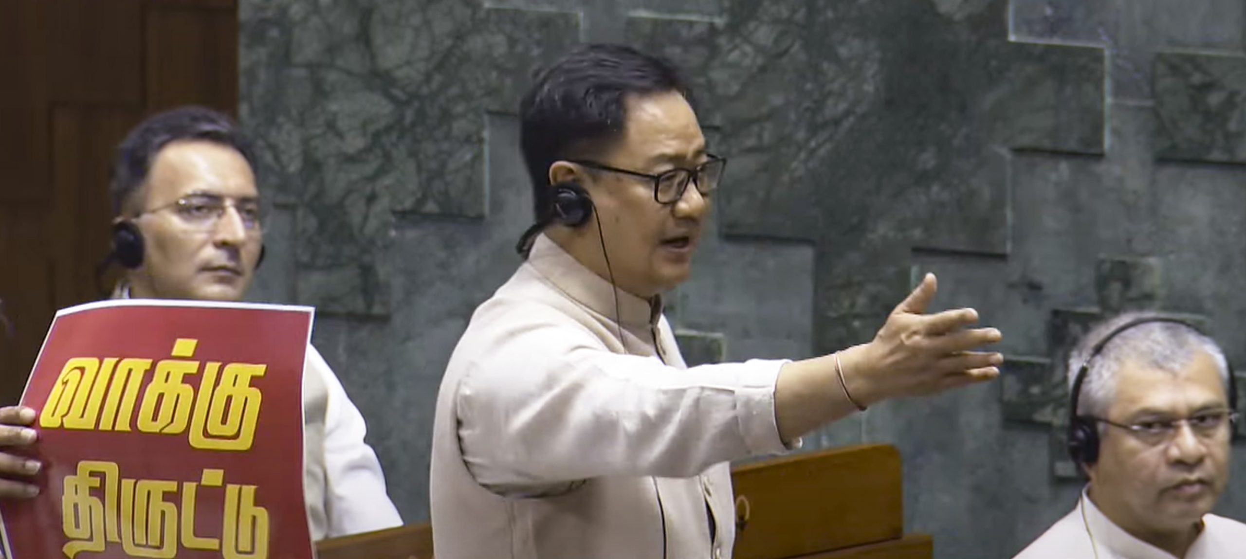 **EDS: THIRD PARTY IMAGE; SCREENGRAB VIA SANSAD TV** New Delhi: Union Minister Kiren Rijiju speaks in the Lok Sabha amid protest by opposition members during the Monsoon session of Parliament, in New Delhi, Wednesday, Aug. 20, 2025. (Sansad TV via PTI Photo) (PTI08_20_2025_000107B)