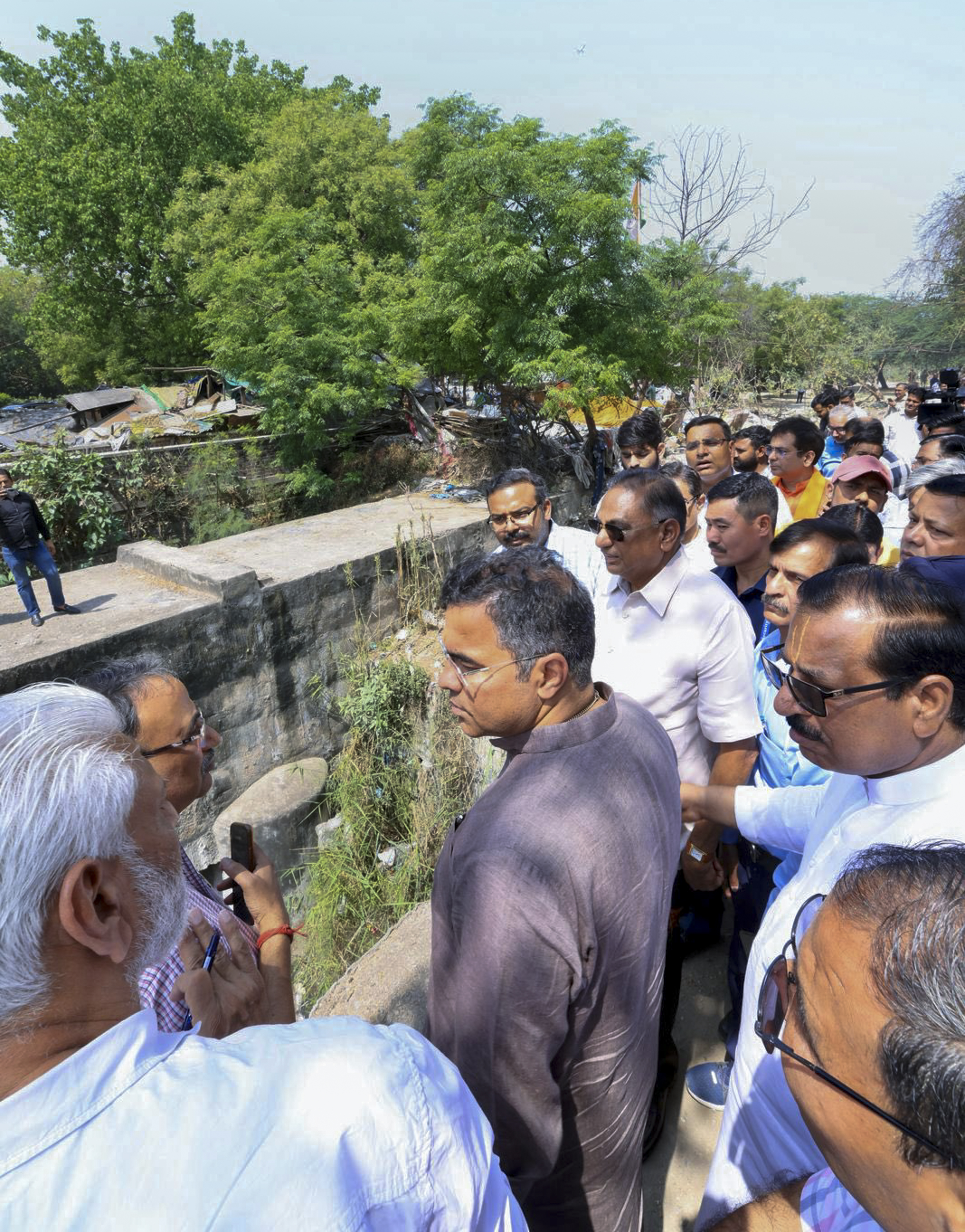 **EDS: THIRD PARTY IMAGE** In this image released by @p_sahibsingh via X on April 12, 2025, Delhi Irrigation & Flood Control Minister Parvesh Verma with BJP MP Ramvir Singh Bidhuri inspects a drain in Srinivaspuri area, in New Delhi. (@p_sahibsingh via PTI Photo)(PTI04_12_2025_000084B)