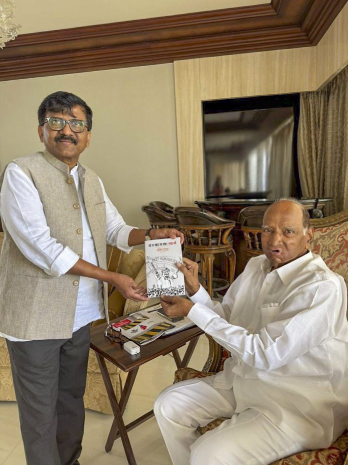 **EDS: THIRD PARTY** In this image posted by @PawarSpeaks via X on May 4, 2025, NCP (Sharad) Chief Sharad Pawar and Shiv Sena (UBT) leader Sanjay Raut during a meeting. (@PawarSpeaks via PTI Photo) (PTI05_04_2025_000085B)