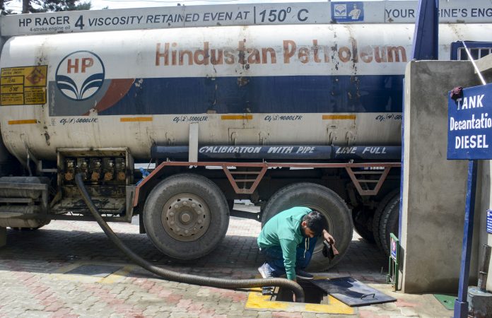 Srinagar: An employee unloads fuel supply tankers at a petrol station, in Srinagar, Thursday, March 26, 2026. Petrol pumps across Kashmir witnessed panic buying on Thursday as rumours of fuel shortage amid the West Asia conflict spread, even as authorities assured that sufficient quantities of essential supplies were available, officials said. (PTI Photo)(PTI03_26_2026_000291B)