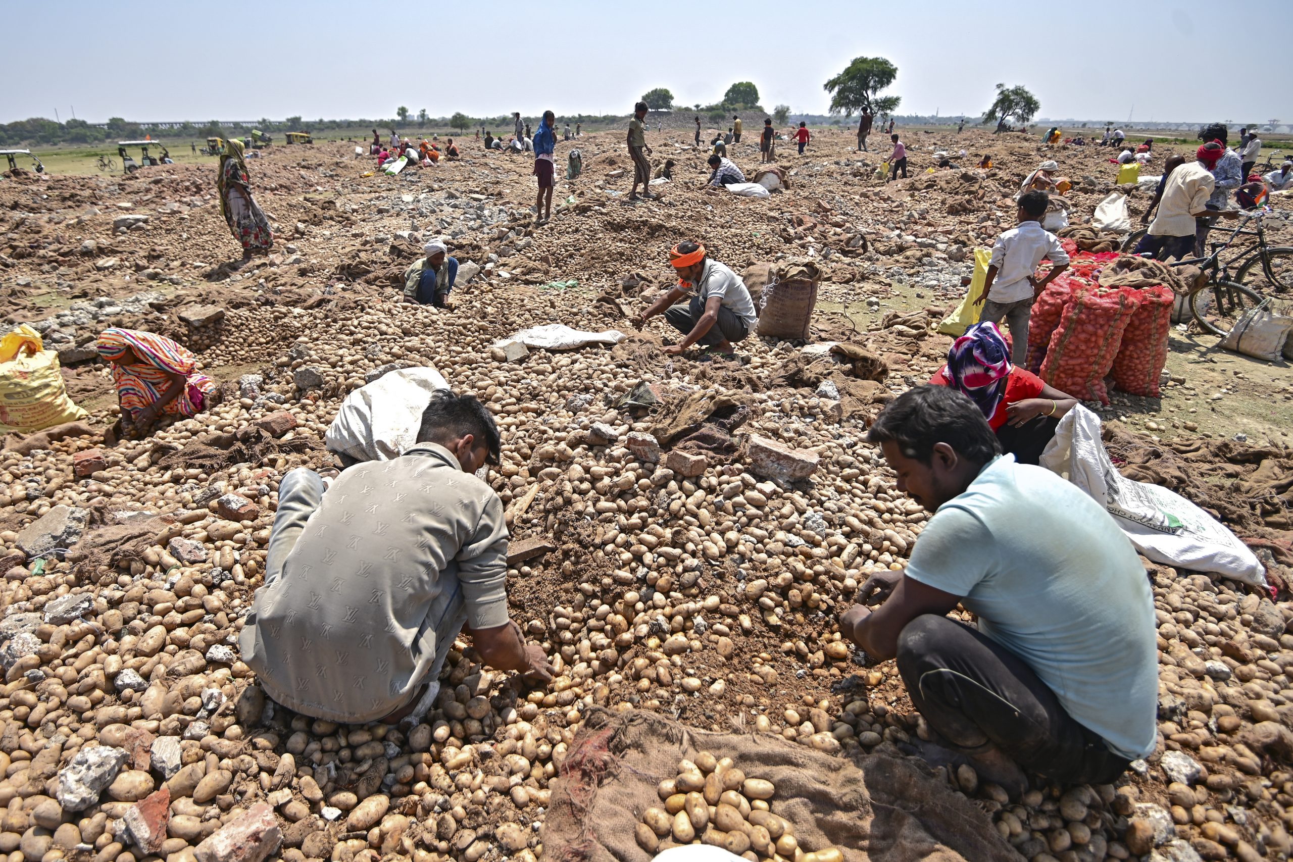 Prayagraj: People fill bags with potatoes, salvaged from debris after a portion of a cold storage collapsed on Monday, in Prayagraj, Thursday, March 26, 2026. (PTI Photo)(PTI03_26_2026_000199B)