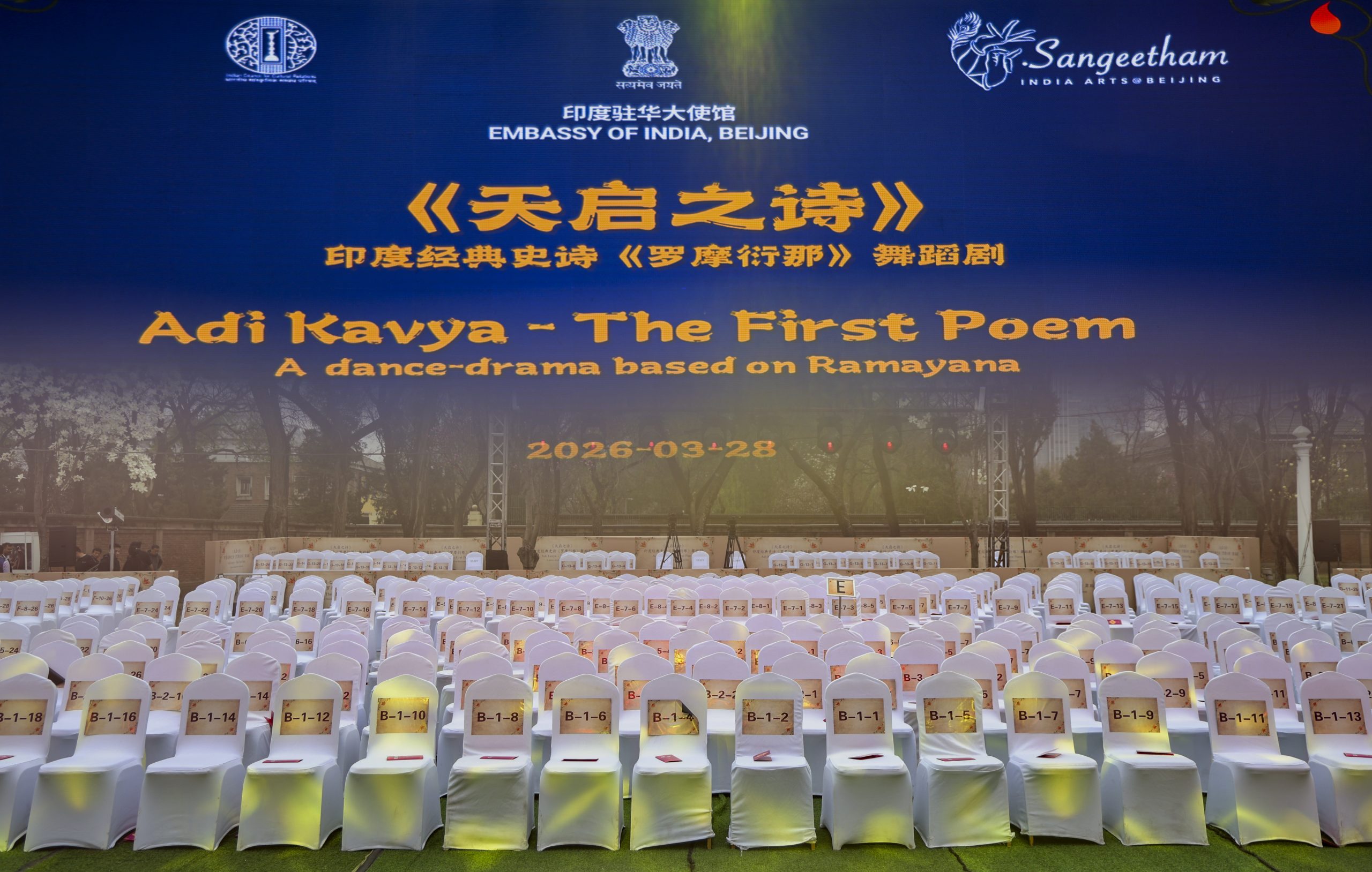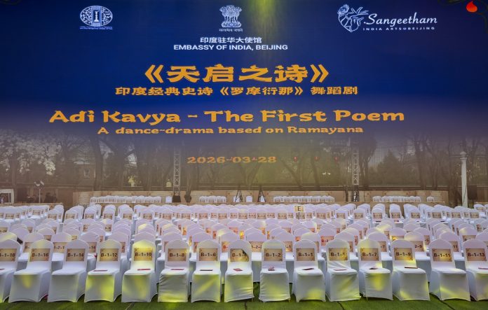 **EDS: TO GO WITH STORY** Beijing: Chairs arranged at the venue ahead of the Ramayana based dance drama ‘Adi Kavya – The First Poem’, organised by the Embassy of India, in Beijing, China, Saturday, March 28, 2026. (PTI Photo)(PTI03_30_2026_000194B)