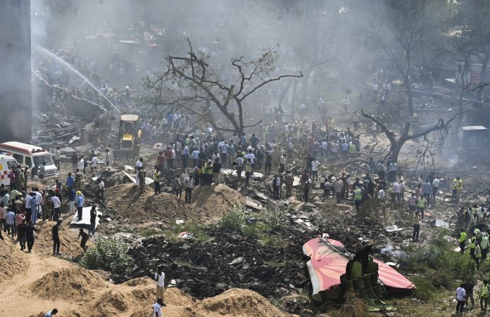 Ahmedabad: People near the debris of the Air India plane that crashed moments after taking off from the airport, in Ahmedabad, Thursday, June 12, 2025. The London-bound plane was carrying 242 passengers. (PTI Photo) (PTI06_12_2025_000197B) *** Local Caption ***