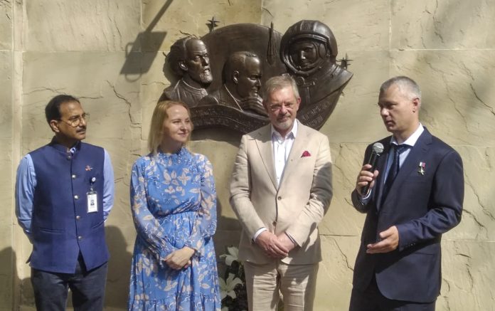 **EDS: TO GO WITH STORY** New Delhi: Russian Ambassador Denis Alipov and cosmonaut Denis Matveev at the unveiling of a plaque in the honour of cosmonaut Yuri Gagarin and other space pioneers from Russia at the Russian House to mark the International Day of Human Space Flight, in New Delhi, Saturday, April 12, 2025. On this day in 1961, Gagarin under the then Soviet Union, became the first human to travel to outer space. (PTI Photo/Kunal Dutt) (PTI04_12_2025_000205B) *** Local Caption ***